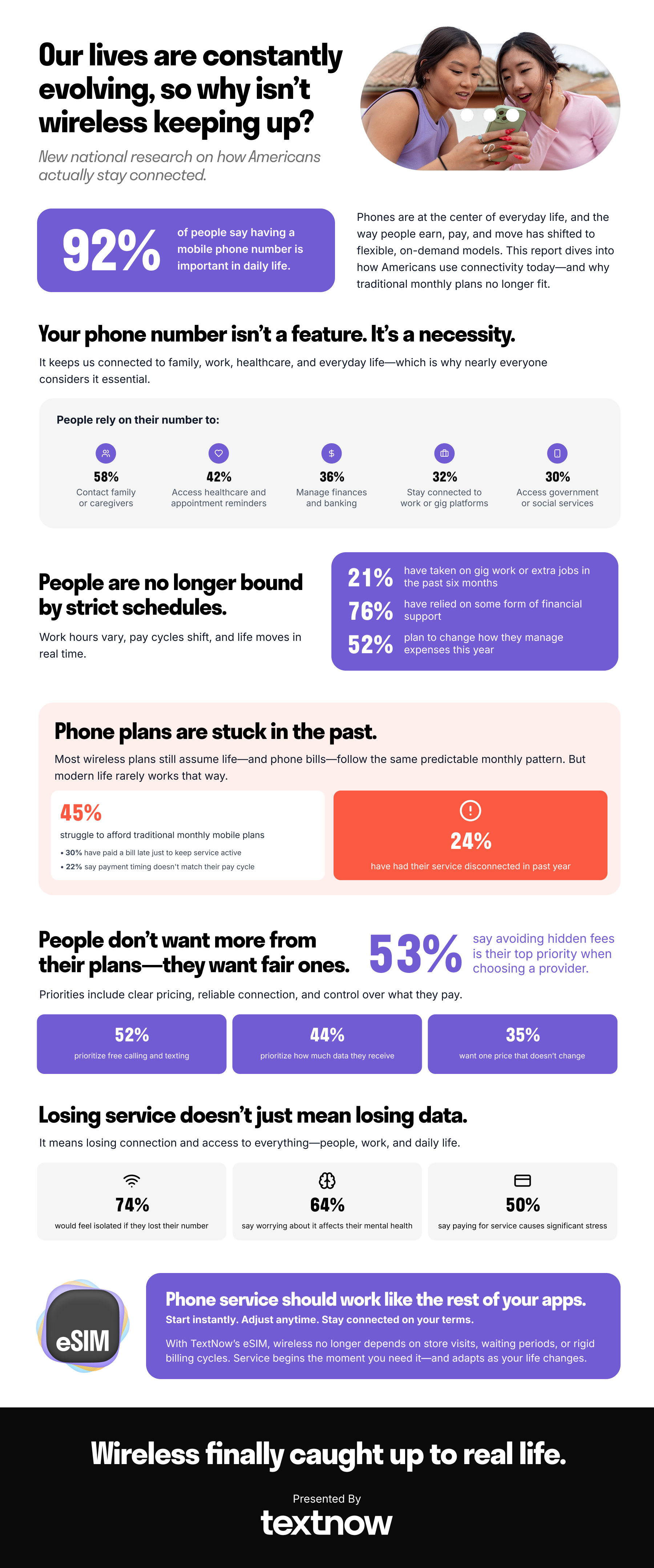These findings are based on a sample of 1,000 U.S. adults surveyed from December 12–16, 2025, by Censuswide on behalf of TextNow, to understand how Americans view mobile connectivity and its role in their financial and emotional well-being.